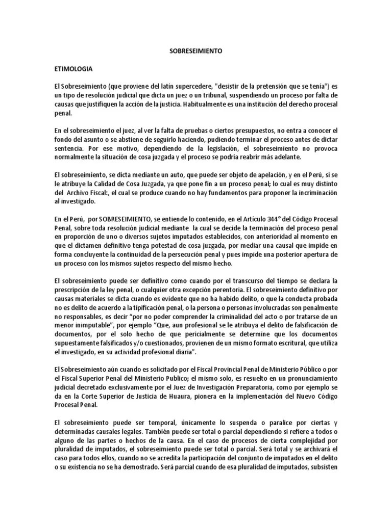 El tema del sobreseimiento y las excepciones es de gran importancia en el campo del derecho procesal penal, debido a que esta institución del sobreseimiento, es . At the moment, we do not have a translation for sobreseimiento. Some of the search features . El sobreseimiento es un acto procesal que pone fin al juicio; Siegel's lawyers hailed the dismissal as a victory for the .